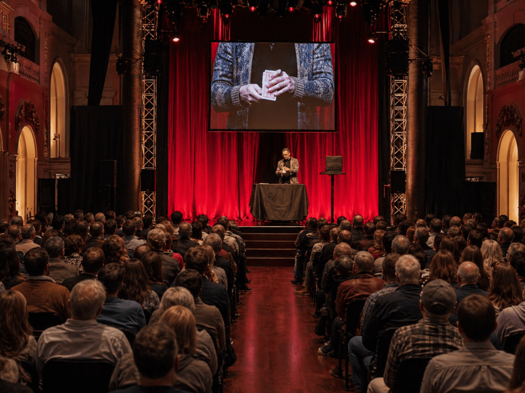 Auf der Bühne steht ein Tisch. Eine Kamera überträgt auf eine große Leinwand, was der Zauberkünstler dort oben macht. Denn mit freiem Auge kann man es im Saal kaum erkennen. Spüren und wirklich erleben kann man es erst recht nicht. Im Grunde sieht man Fernsehen. Der Zauberkünstler könnte genauso gut an einem ganz anderen Ort sitzen.