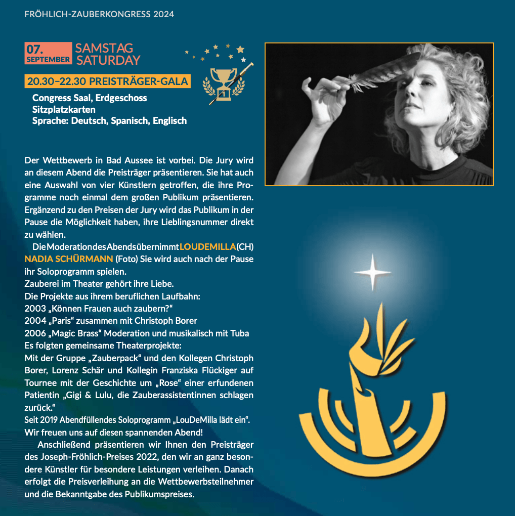 Die 4 besten Teilnehmer des internationalen Wettbewerbs treten zum Finale an.Eine vom Weltverband zertifizierte Jury vergibt die Preise. Zusätzlich haben die Zuschauer die Möglichkeit ihre Lieblingsnummer für den Publikumspreis zu wählen.Abgerundet wird der Abend durch Moderation und Soloshow von Petra Schürmann aus der Schweiz. Die charismatische Künstlerin wird sie verzaubern!