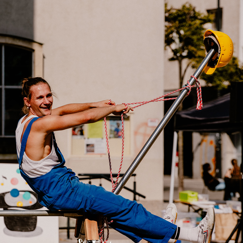 Durch verblüffende Akrobatik, Jonglage und ein großes Herz bewegen sie sich hin zum “Grande Feierabend”.