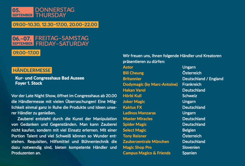 Wir konzentrieren uns in erster Linie auf Händler und Künstler, die ihre eigenen Requisiten und Ideen vermarkten. Sie werden bei uns keine Filialen von Murphy Magic und anderen Großhändlern finden, die alle die selben Produkte haben. Klasse statt Masse ist die Devise. Händler die ihre Produkte selbst präsentieren und keine Videos abspielen!!